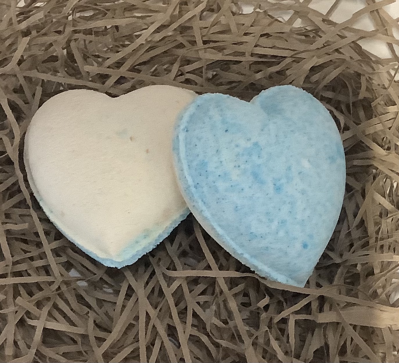 A heart shaped bath bomb with a gorgeous wrap round fragrance of Chamomile and Honey, in delicate shades of blue and orange representing the fragrance
